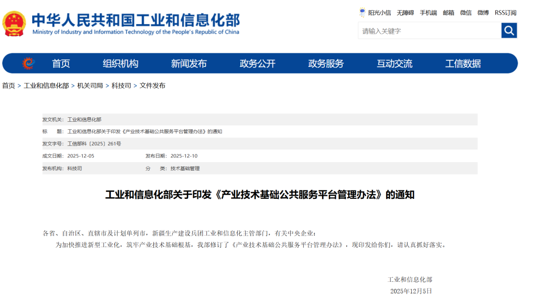12月10日,工业和信息化部印发《产业技术基础公共服务平台管理办法》。